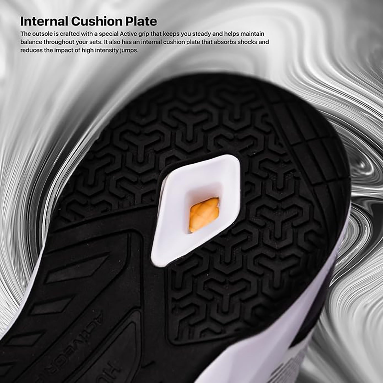 The outsole is crafted with a special Active grip that keeps you steady and helps maintain balance throughout your sets. It also has an internal cushion plate that absorbs shocks and reduces the impact of high intensity jumps.